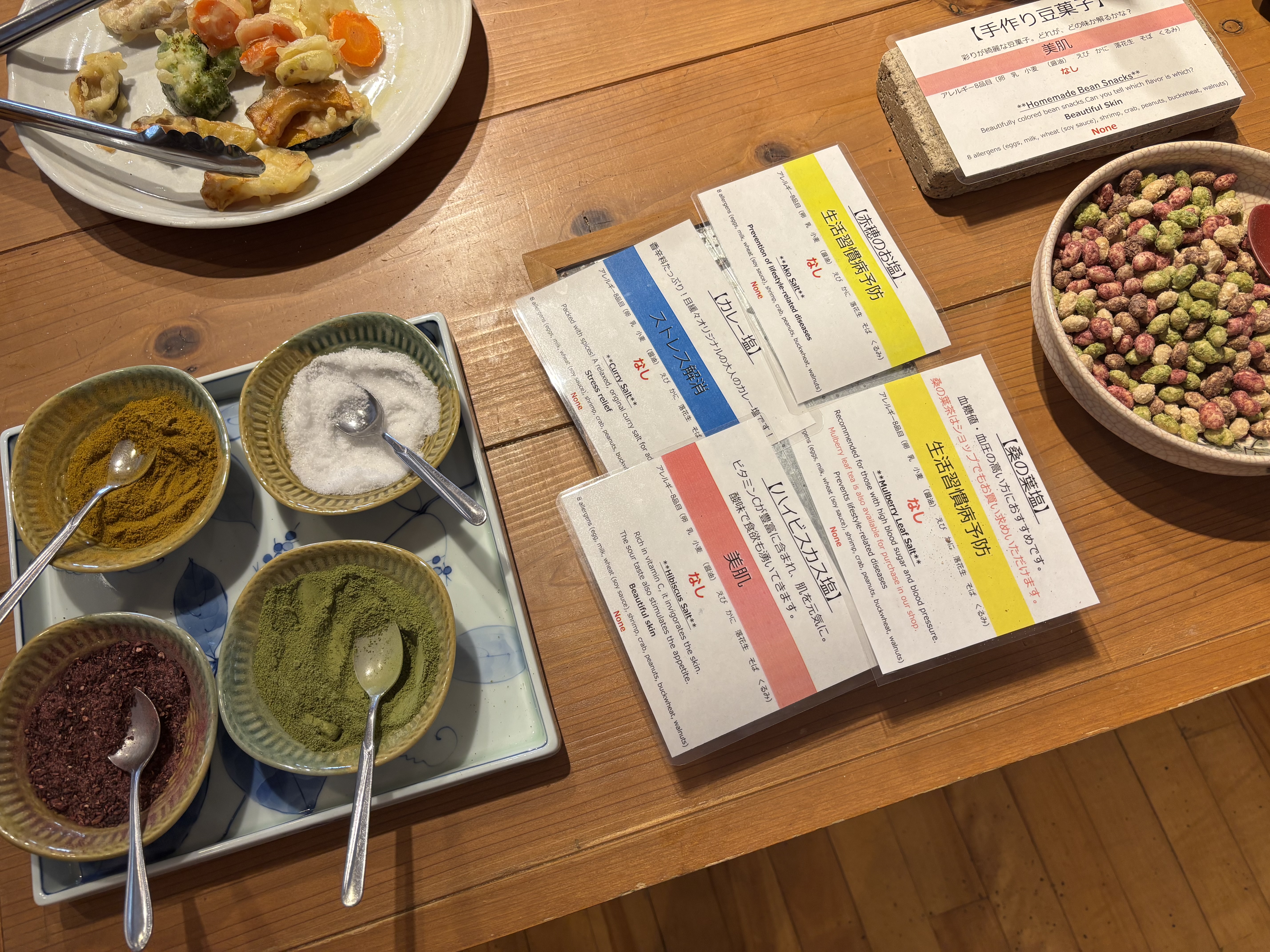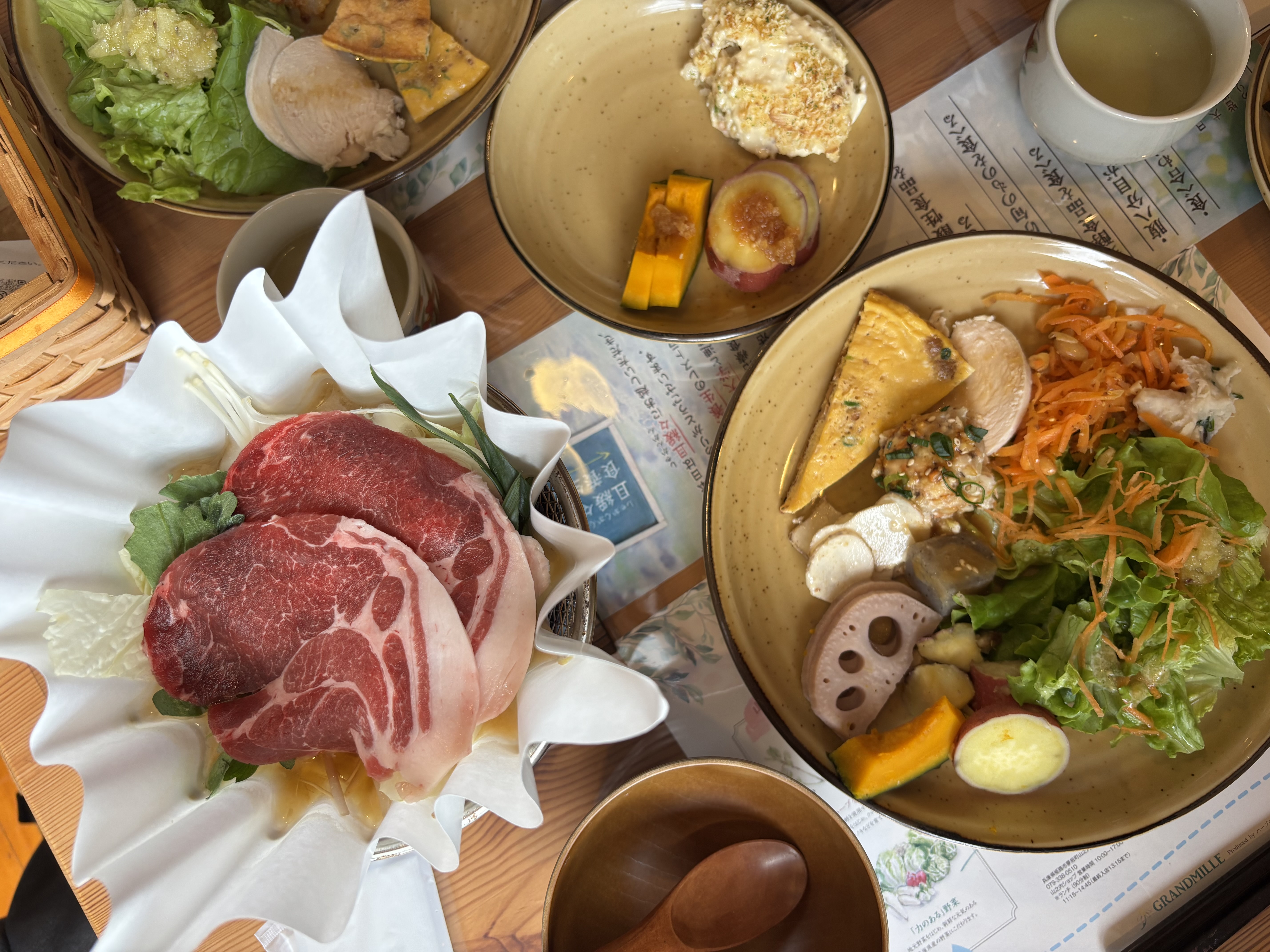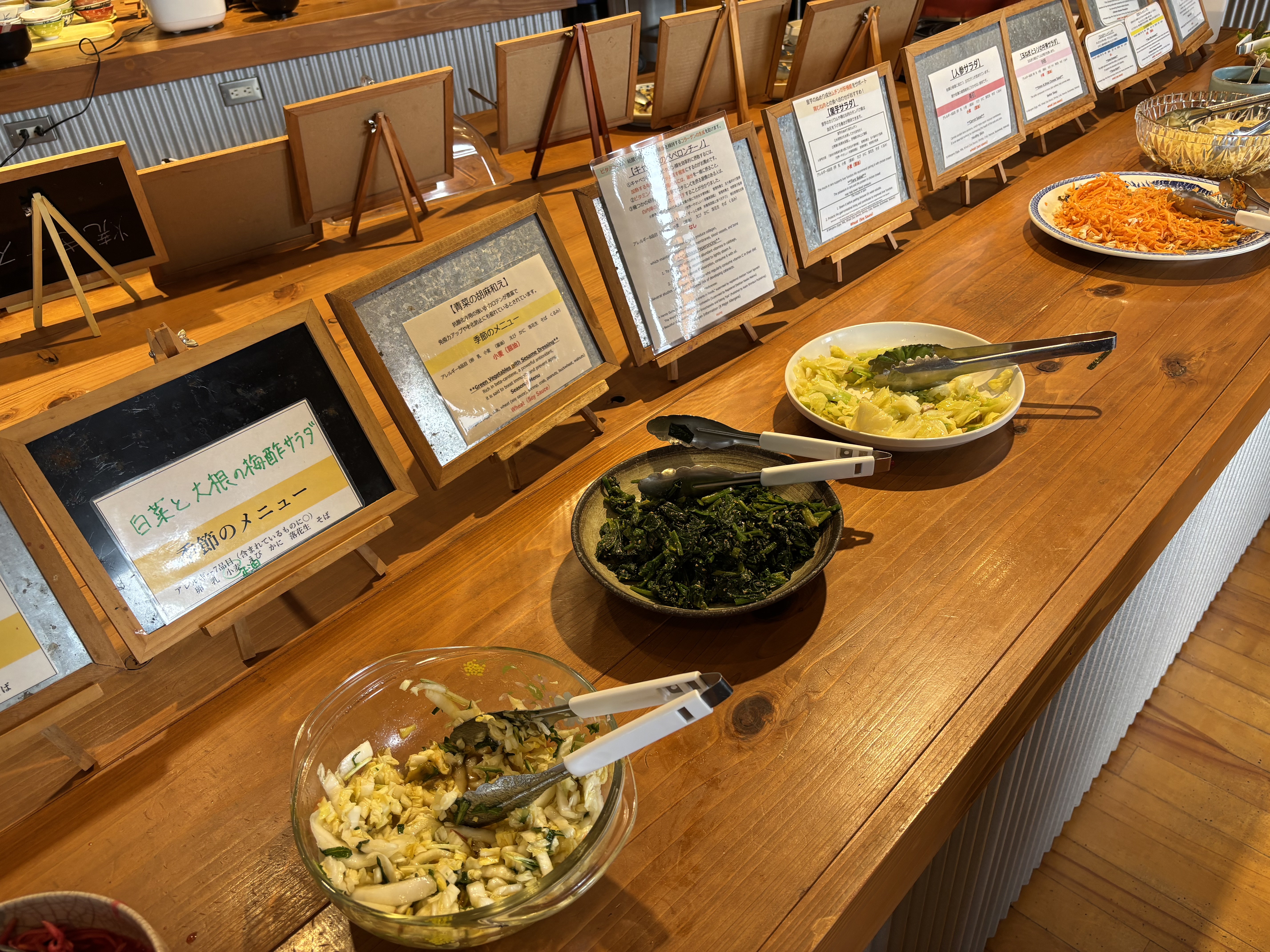 野菜たっぷりの健康ビュッフェ。朝採れ野菜を生かした料理には「ストレス解消」「免疫力アップ」などの効能も添えられ、味わいながら体調を整えられるのも魅力です。